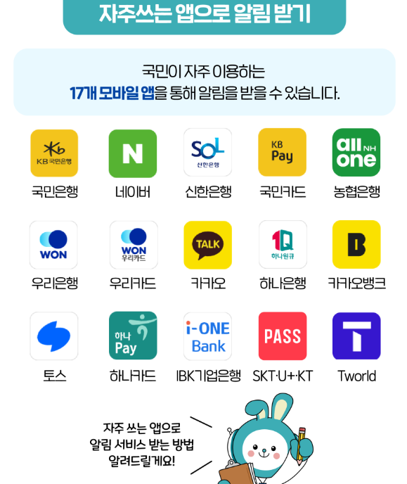 이 외에도 15개 민간 앱에서도 국민비서 알림을 받을 수 있어요!