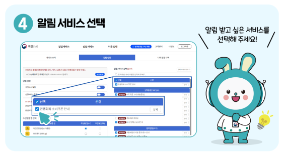 - ④ 알림 항목 선택: 받고 싶은 알림 항목(소비쿠폰 포함) 체크