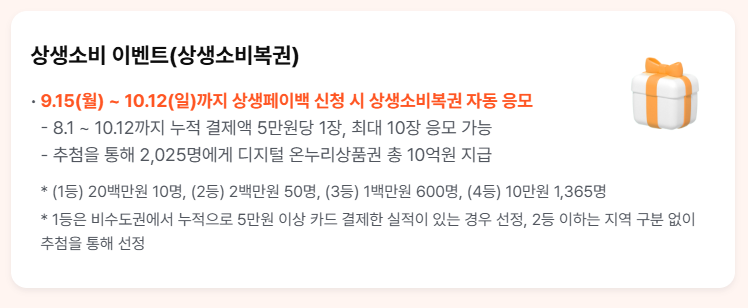 9.15 ~ 10.12까지 상생페이백 신청자에 한해 상생소비복권 자동 응모 혜택!