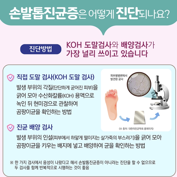 • 손발톱의 인설(각질)을 채취 → 배지에 넣어 진균을 배양 → 균 종류를 정확히 파악