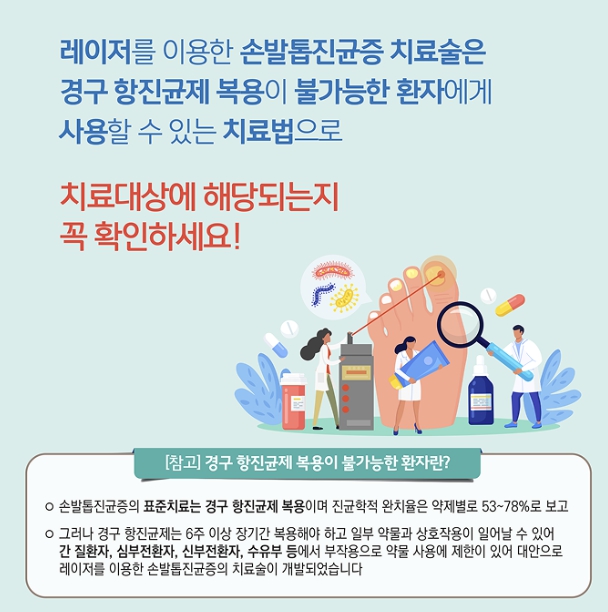 특히 최근에는 항진균제를 복용하기 어려운 환자들이 늘면서, **'레이저를 이용한 손발톱진균증 치료술'**이 주목받고 있습니다. 이 치료법은 보건복지부로부터 신의료기술로 공식 인정받았으며, 안전성과 효과성 면에서 새로운 대안으로 떠오르고 있습니다.