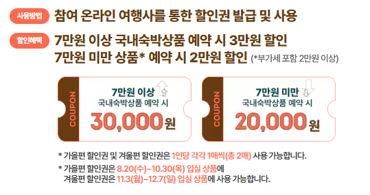 - 할인 금액: 7만원 이상 숙소 3만원 할인, 7만원 미만 2만원 할인