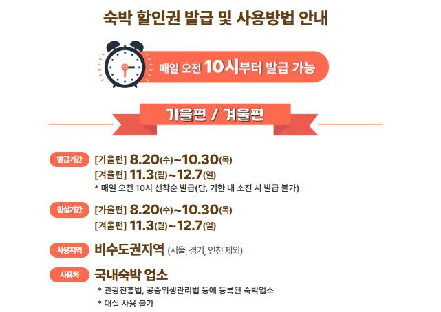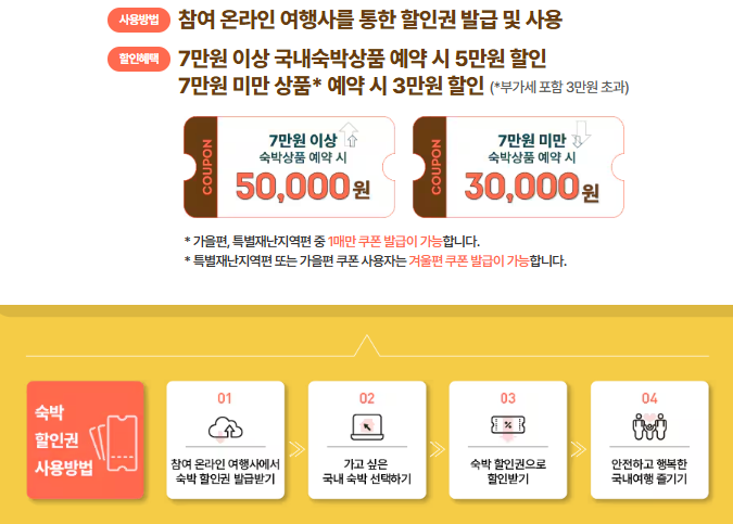- 할인 금액: 7만원 이상 숙소 5만원 할인, 7만원 미만 3만원 할인