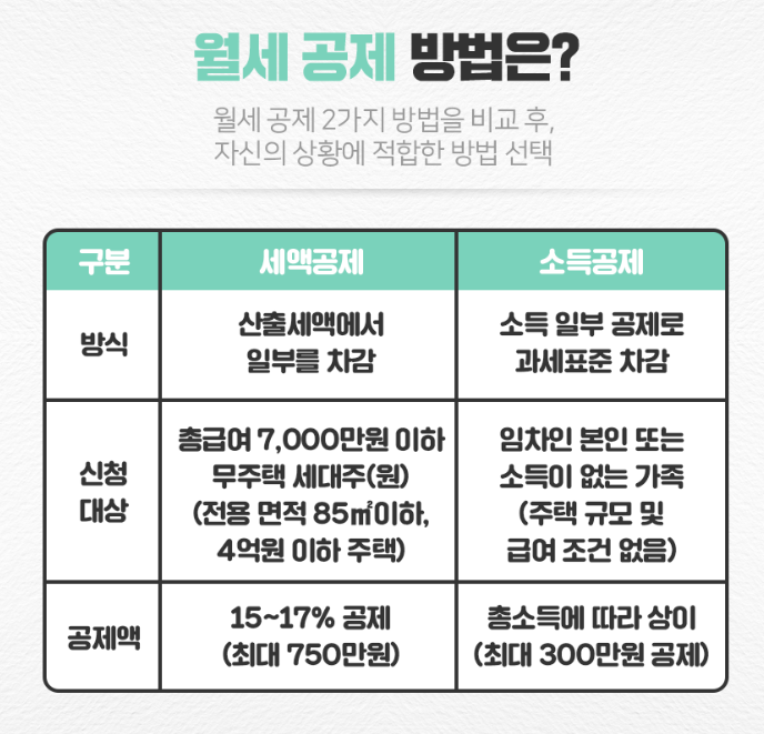 월세 공제는 크게 세액공제와 소득공제로 나뉩니다. 두 제도는 동시에 중복 적용할 수 없으며, 아래 표로 비교해보세요.