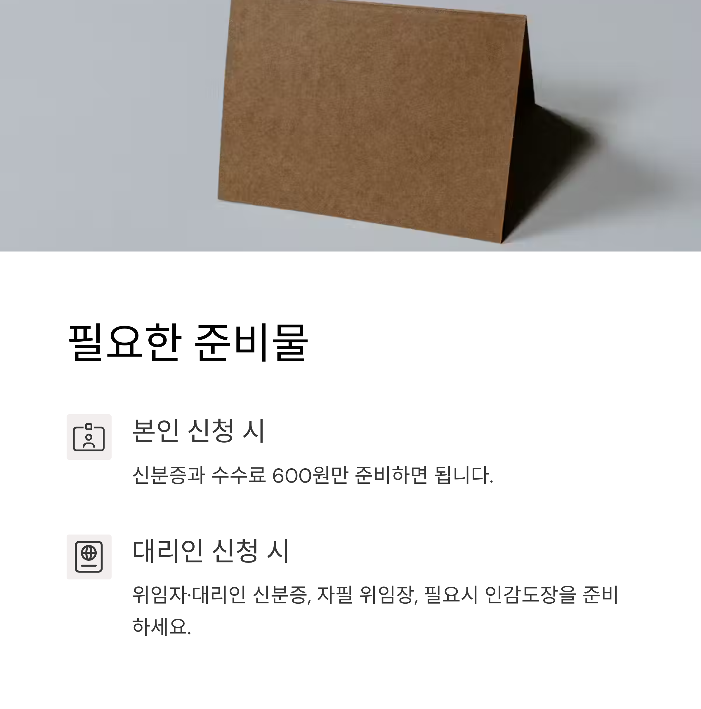 | 본인 신청 시 준비물 | 신분증, 수수료 600원 |