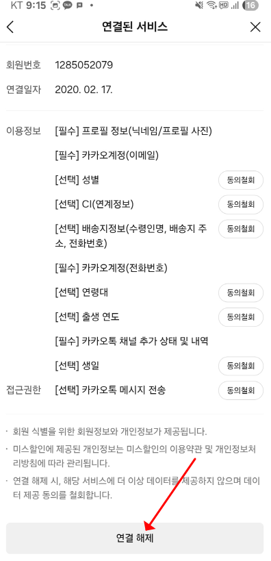 카카오 계정 서비스 연결 끊기 완료