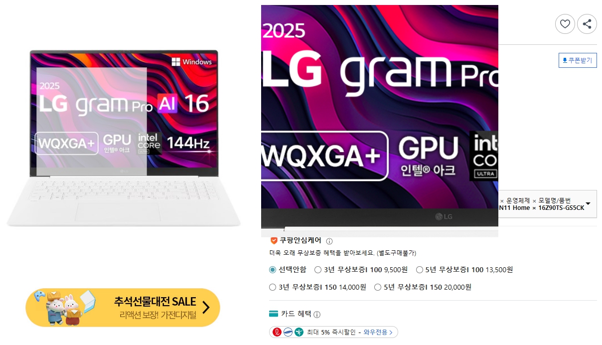 LG전자 2025 그램 Pro AI 16 WQXGA Ultra5 루나레이크 - 노트북 | 쿠팡