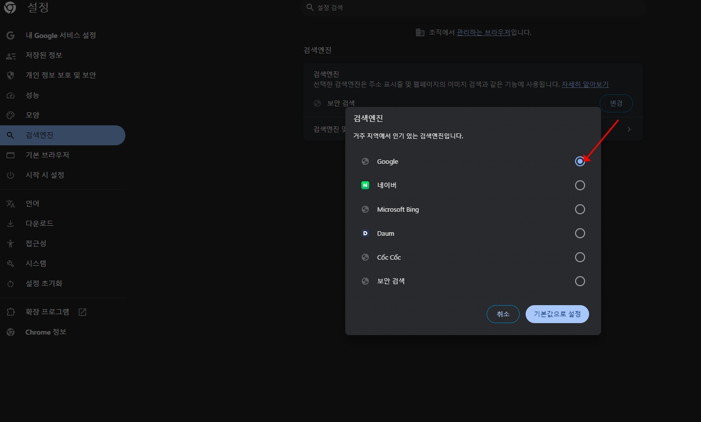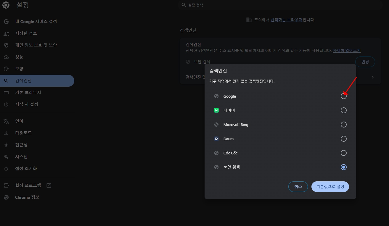 왼쪽 메뉴에서 [검색엔진]을 클릭한 후, 기본 검색 엔진이 Google(구글)로 설정되어 있는지 확인합니다.