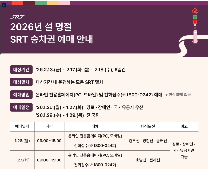 2026년 설 명절이 다가오면서 SRT(수서고속철도) 설 승차권 예매 일정과 방법이 발표되었습니다.