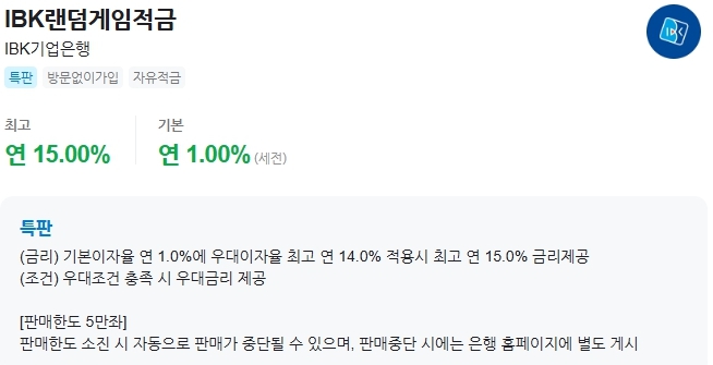 IBK 랜덤게임 적금 연 1.00% 최대 14%p 연 15.00% 자유적립 (100일)