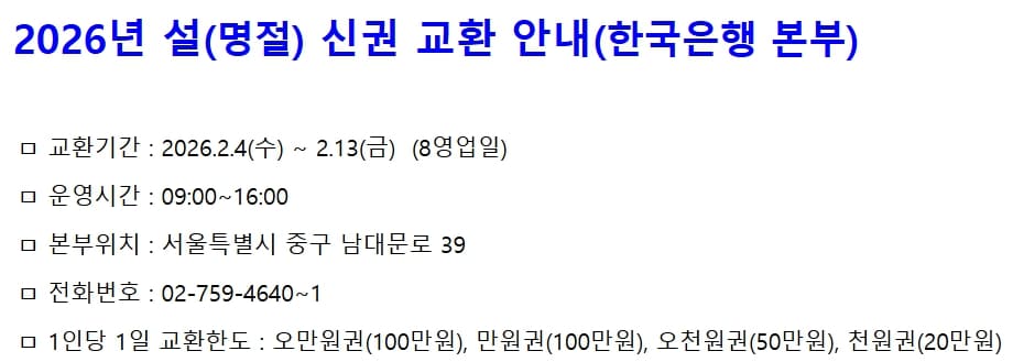 | 신권 교환 장소 | 시중은행 지점 (명절 전 공지 확인 필수) |