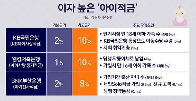 - KB 아이사랑적금: 최고 연 10% (조건 까다로움)